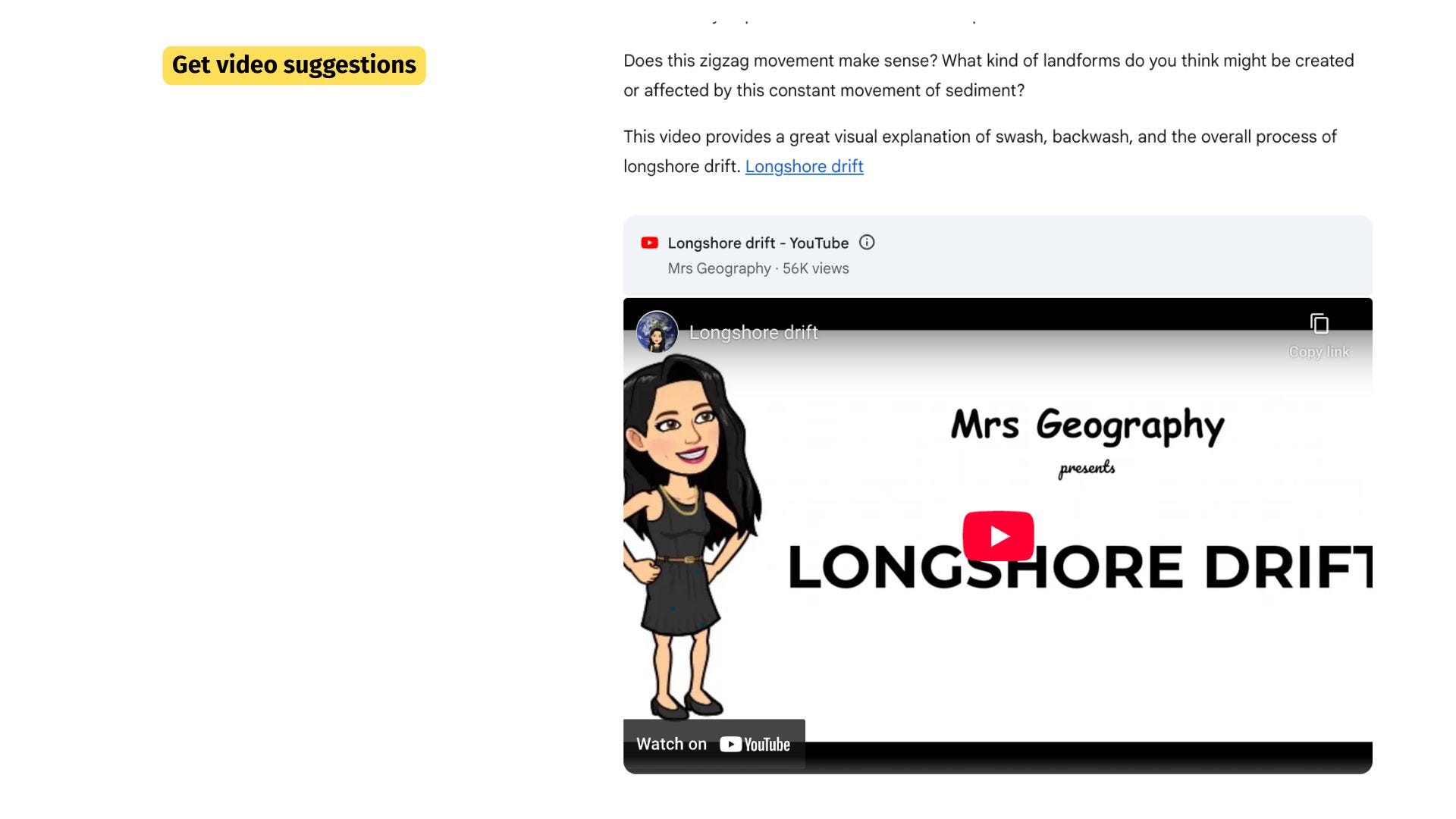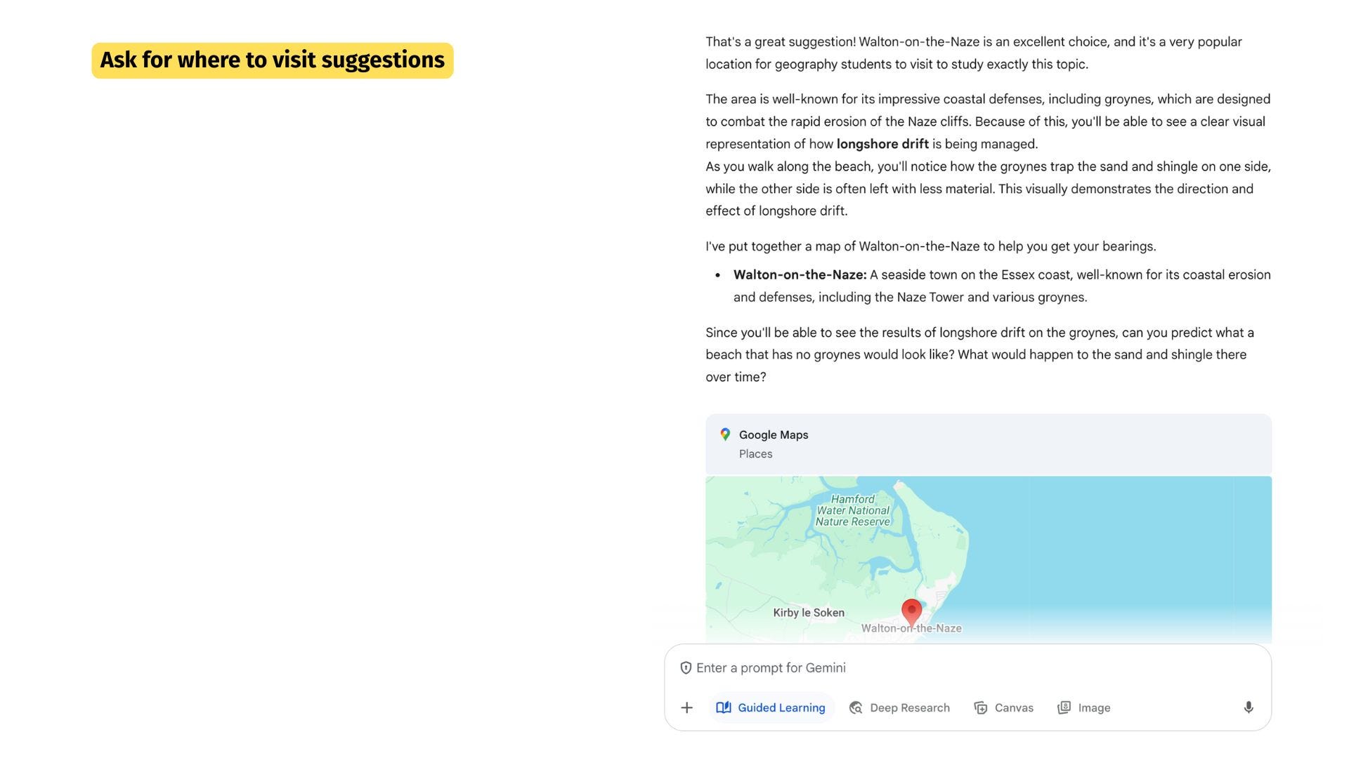 I then asked for some ideas where I could visit in the UK to see longshore drift in action. It made some suggestions after I gave it the county I live in (nothing more) but I then suggested my own (based on my own experience*). Gemini then helped by providing a live Google Maps to help me get there.