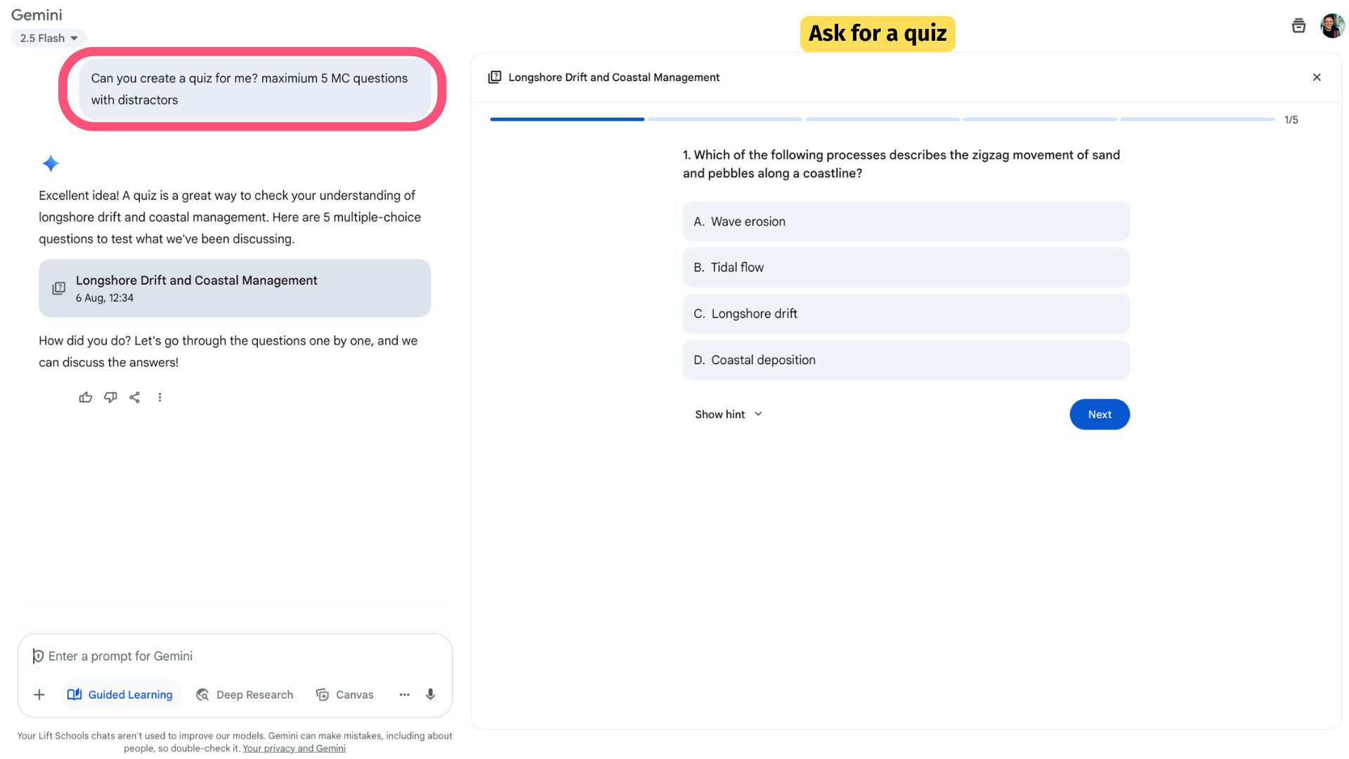 First up, Guided Learning is easy to find for all users. I happen to be in 2.5 Pro in this screenshot but it appears in Flash mode too. I dived straight in by asking Gemini to “help me learn about longshore drift'“.