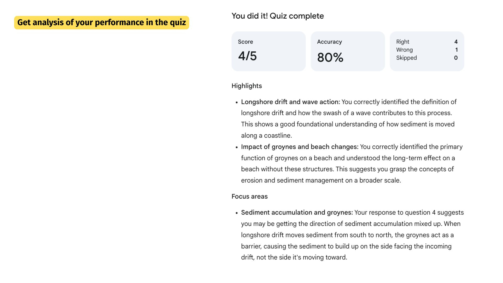 I completed the quiz, deliberately making some mistakes to see what would happen. Gemini duly offered me a quick overview summary of how I performed in the quiz with score, % and a basic question breakdown.