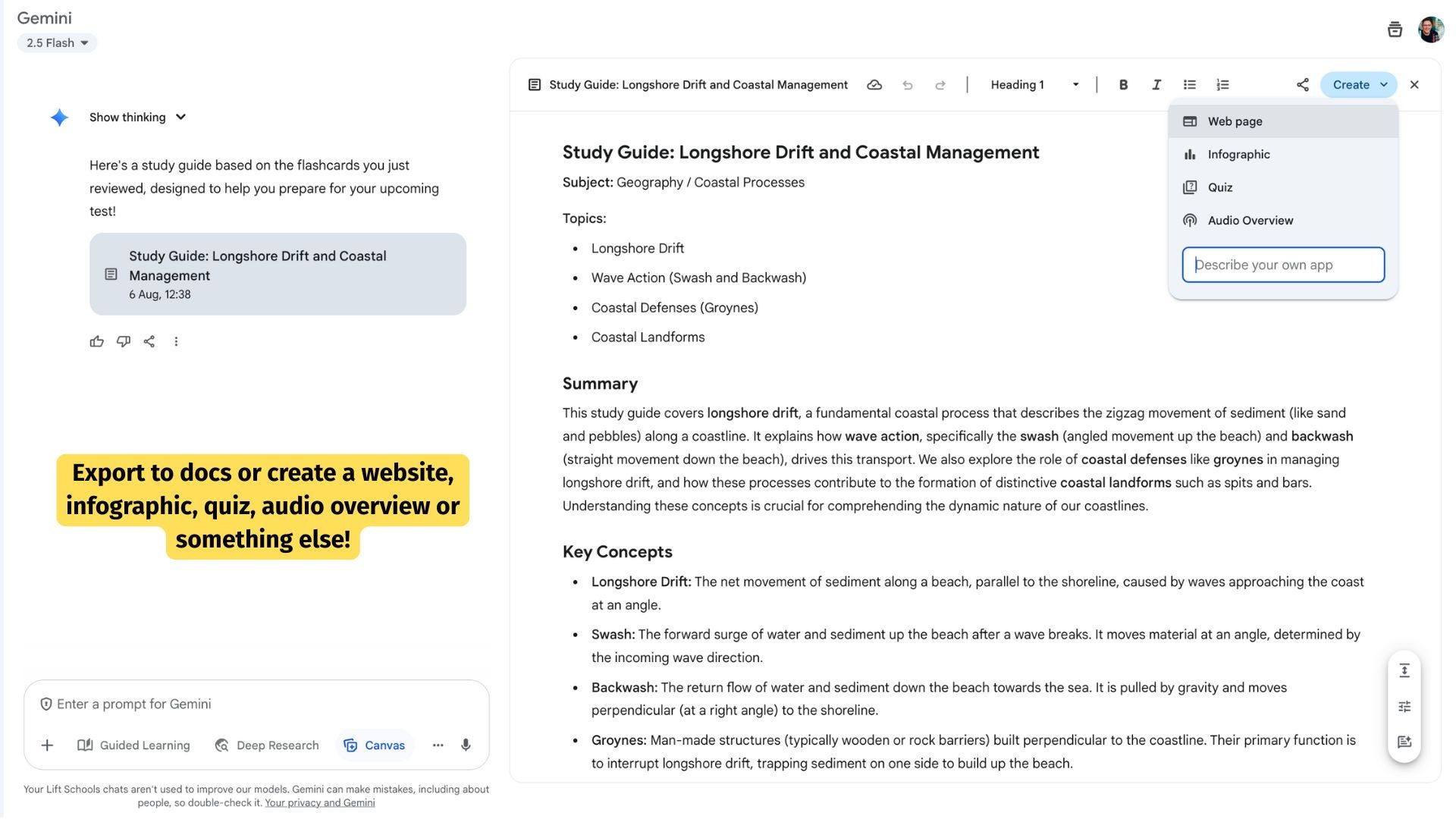 It then opened up a Canvas to create the guide. At this point I could work with Gemini to shape this guide and then either export it to Google Docs or choose to create a website, infographic, further quiz, audio overview or “something else”