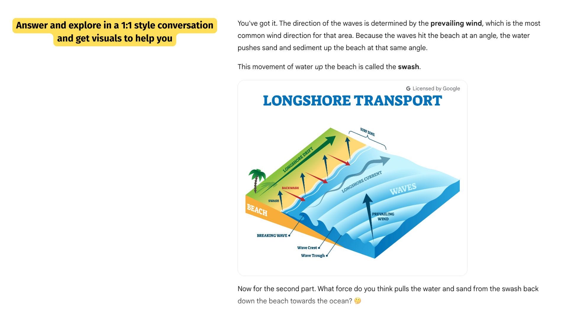 As we can see, Gemini asks me where I’d like to start from 3 available options; a step by step of how longshore drift works, the coastal landforms it creates or the human impact of longshore drift. I simply responded with the number 1 and we entered into a 1:1 style tutoring style back and forth. Then, unrequested, Gemini presented me with a visual graphic to help me process the information. This is very welcome for me as someone who is neurodiverse and appreciates multi-modal approaches to learning.
